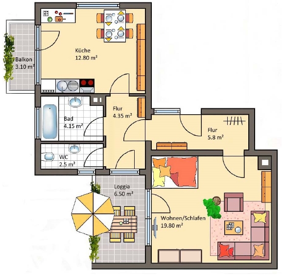 Die Räumlichkeiten sind funktional geschnitten und bieten zahlreiche Möglichkeiten zur individuellen Einrichtung. Helle Oberflächen, ein gepflegter Laminat- und Fliesenboden schaffen eine angenehme Wohnatmosphäre.