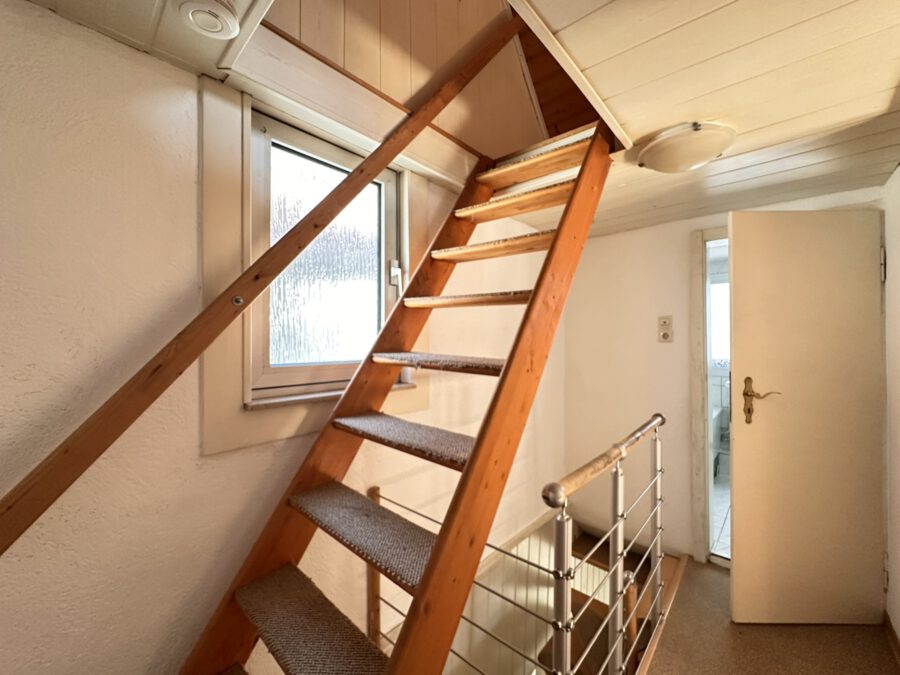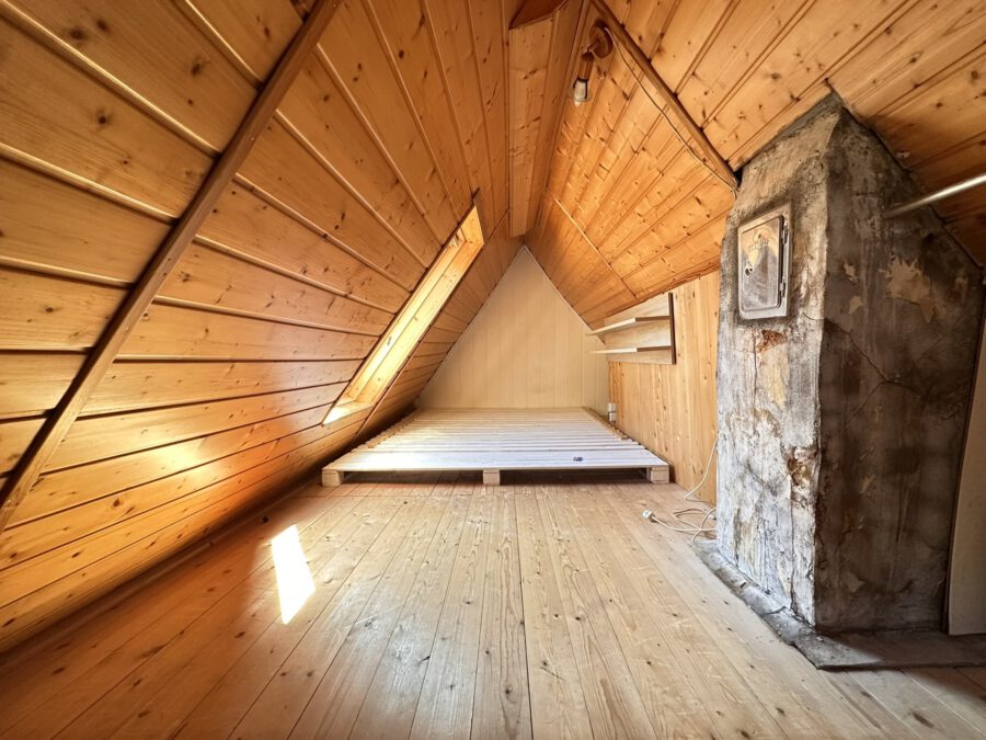 Über eine offene Treppe gelangen Sie in das Obergeschoss mit einem Schlafzimmer, einer kleinen Kammer sowie dem Tageslichtbad mit Badewanne. Vom Obergeschoss aus führt eine weitere Treppe in den ausgebauten Dachspitz, der sich ideal als Gäste- oder Arbeitszimmer eignet.